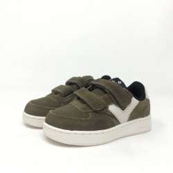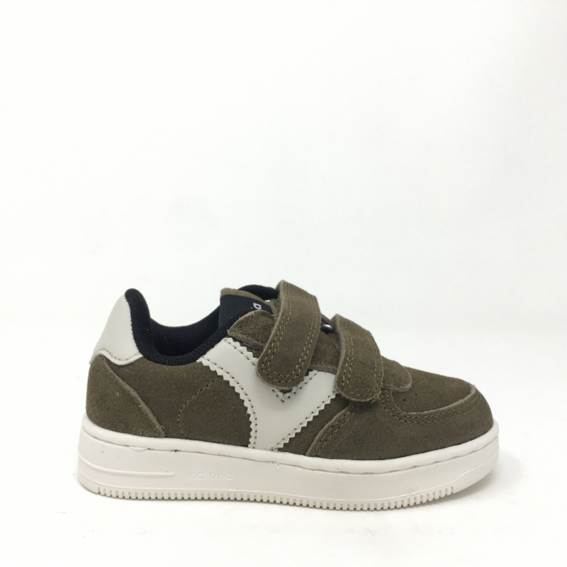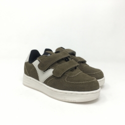 Deportiva de piel serraje en color kaky con detalle de v en blanco. Cierre con dos velcros.