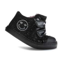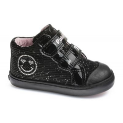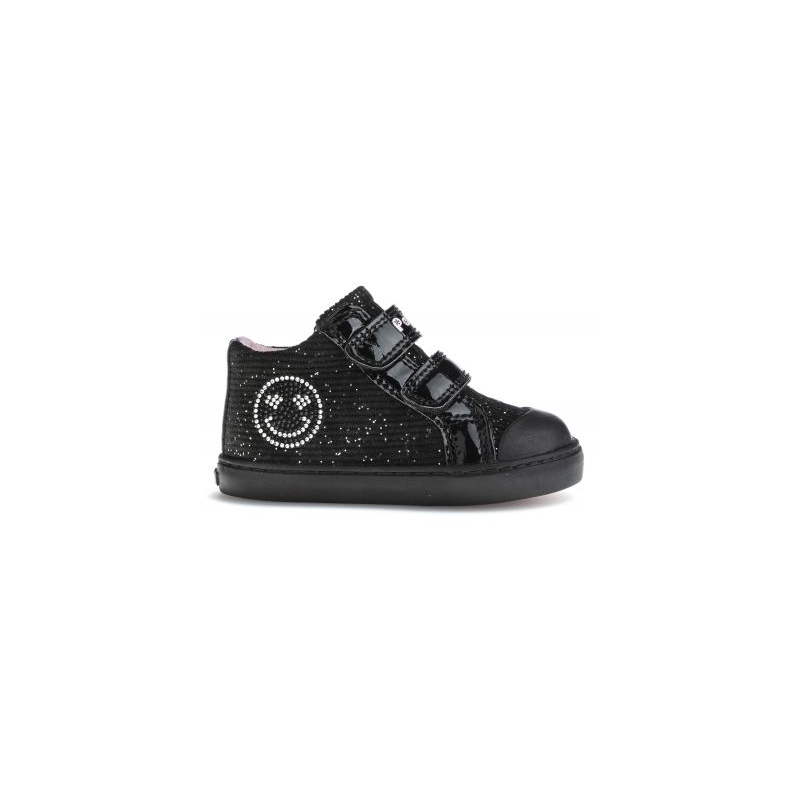 Diseño de última tendencia para un look moderno y casual, de pana en color negro con detalle de emoji.Forro textil transpirable. Planta extraíble de cuero natural apta para todas las necesidades. Piso de goma flexible, antideslizante y resistente al desgarro. Se abrocha muy fácilmente con cierre adherente, garantizando la correcta sujeción de cualquier pie.