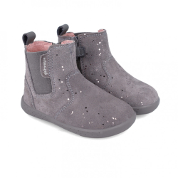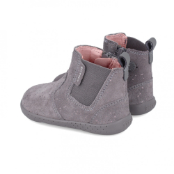 Botín de piel en color gris con detalles de lunares plateados. Cierre con cremallera lateral.