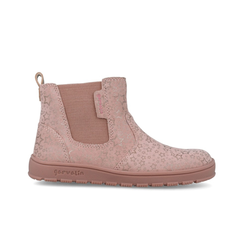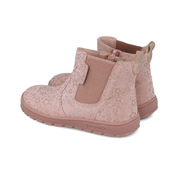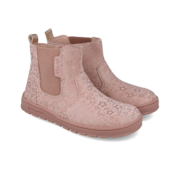 Botín de piel serraje laminado con estampado de estrellas en color rosa. Cierre con cremallera lateral. Ligeros, flexibles y drop cero.