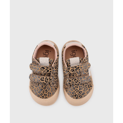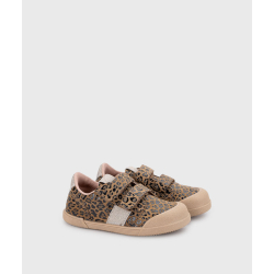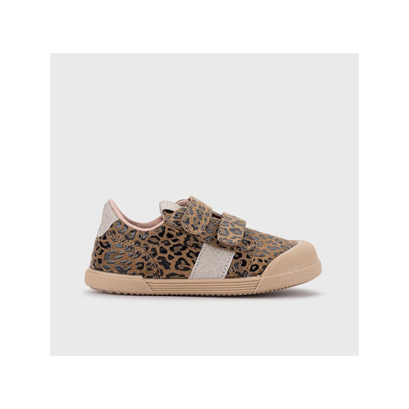 Deportivos de piel marrón con grabados animal print casual de concepto barefoot, cero drop, flexible y blandito, plantilla extraíble y cierre adherente para mayor ajuste y autonomía.