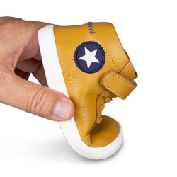 Botín de piel en color mostaza con cierre en gomas y velcro.