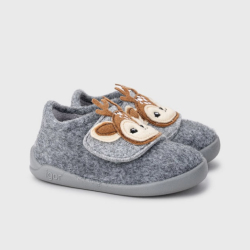Zapatilla de estar por casa para niños y niñas con detalle de reno, de concepto barefoot medium, cero drop, flexible y blandita, fabricada en un tejido súper blandito, calentito y suave.