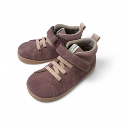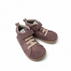 Botita respetuosa de piel en malva, con cierre velcro y elástico. Con una suela fina, flexible y sin drop. Horma ancha para que los dedos estén sueltos. Plantilla extraible.