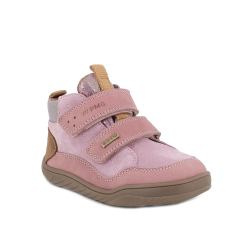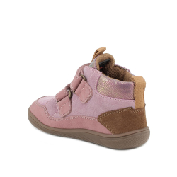 Botines barefoot de piel en color rosa. El cierre con cordones elásticos y tira de velcro permite un ajuste adaptable y una correcta sujeción.