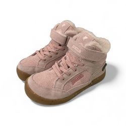 Botín barefoot en serraje y textil, con membrana de agua. Cierre velcro y elástico. Interior forro con pelo. Plantilla extraíble.