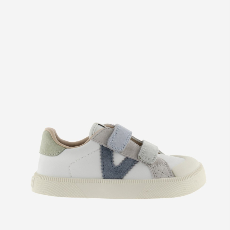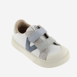 Zapatillas deportivas barefoot para niños fabricadas en efecto piel blanca con piezas multicolor de serraje. Cierre de tiras adherentes que aportan mayor sujección y facilitan el calce, fomentando su autonomía. Suela de TPR ligeramente tostada con refuerzo en la puntera para una mayor resistencia y durabilidad. Talla: ¡Consejo! Elige una talla menos