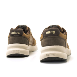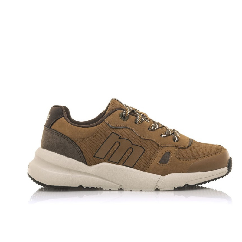 Zapatilla deportiva Mare Mustang para niño, su diseño es en napa de color cuero combinada con tonos tierra, su estilo es sport casual, con piso de volumen en tono crema. Logo de la marca en el lateral y nombre en el talón y la lengüeta. Cierre de cordones planos de estilo deportivo.