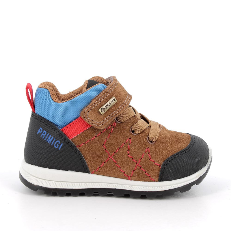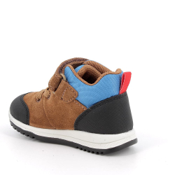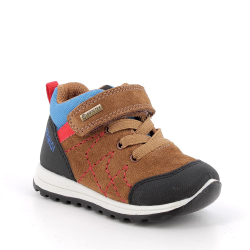 Deportivas primeros pasos, en GORE-TEX, de color cuero con detalles azules. Los cordones elásticos hace que sean prácticos de poner y rápidos de ajustar. Confeccionados con protectores de goma en la puntera y el talón. El pie apoya en una confortable plantilla que puede extraerse para una mayor higiene.